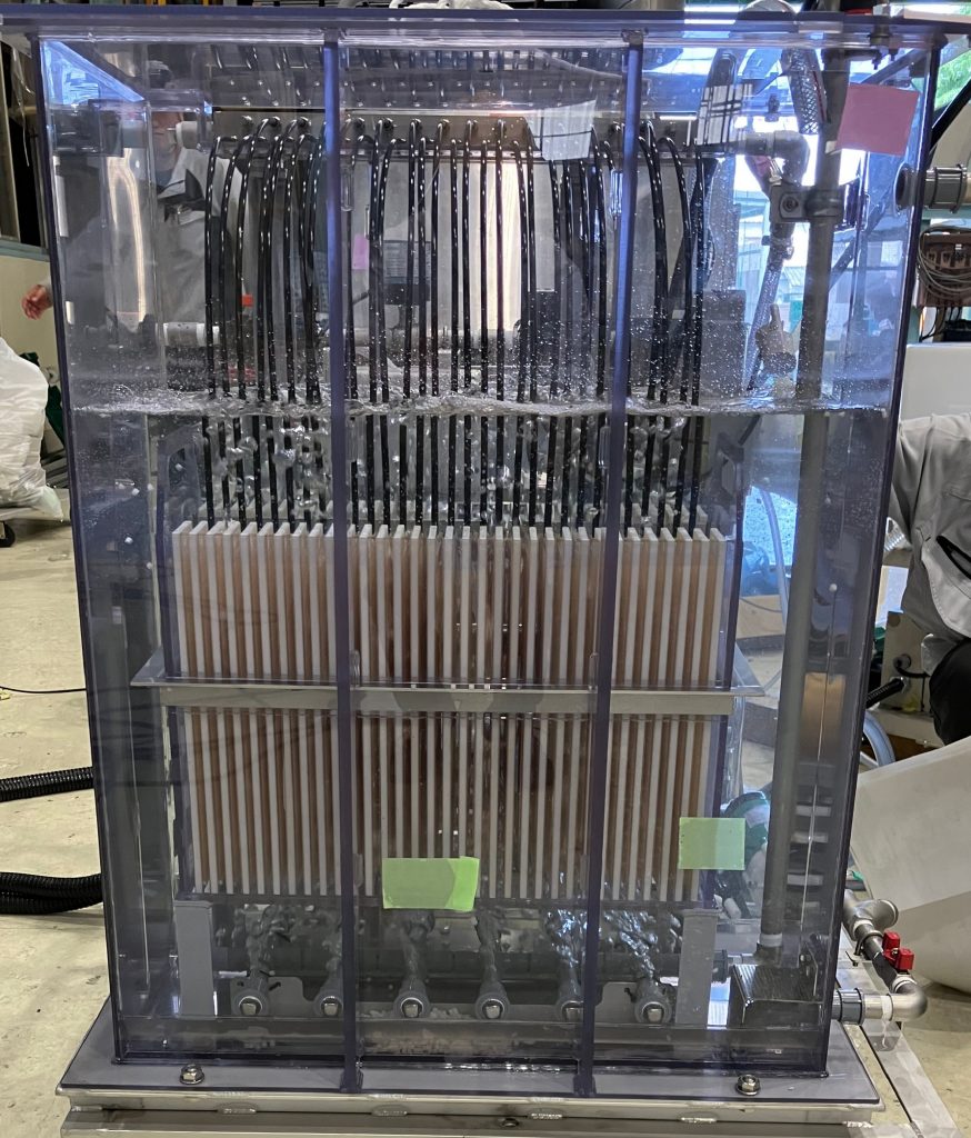本システムに搭載した当社のMF膜「FILPLATE®」は、工場の排水処理や下水処理などに採用されております。透水性の確保に重要な膜表面の親水機能が持続することに加え、曝気による上昇流や気泡によって膜表面の感光性樹脂層を除去するため、膜の目詰まりによる膜機能の低下を防ぐことができます。