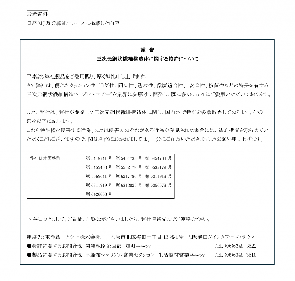 東洋紡エムシー株式会社(本社:大阪府大阪市、代表取締役 社長執行役員CEO:森重 地加男、以下「当社」)は、本日付発行の日経MJ及び繊維ニュースに、三次元網状繊維構造体における特許権について「謹告」を掲載しましたので、お知らせいたします。