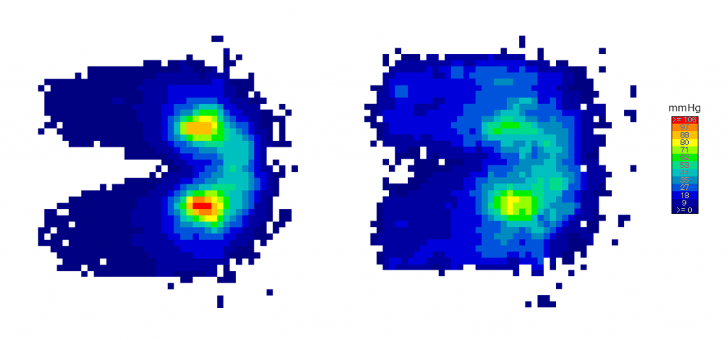左は「ブレスエアー®」製クッションを使用しなかった場合。右は体圧が緩和されているのが分かる